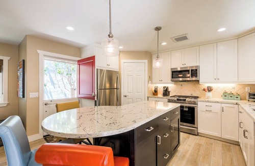 Pristine and air conditioned, this 2 bedroom/2 bath 1220 sq ft beach house has a gorgeous kitchen with quartz countertops and stainless steel appliances including a gas range, microwave, refrigerator with filtered water and an ice maker and a KitchenAid dishwasher. The kitchen island serves as the dining table and accommodates up to 4 people.