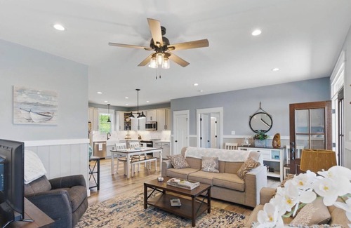 Wake-up in this stunning 4 bedroom, 3.5-bath home built in 2023. The hallmark of the home is the wide front screened-in porch—perfect for relaxing with a panoramic view of the water over looking the new pier! The open living space and airy family room bring the perfect vacation vibes! The main level features the kitchen, living room with a TV, laundry room, half-bath, and master suite with a TV, and a full bathroom featuring a walk-in shower and garden tub. Upper level features 2 bed rooms with TV's, sharing a full bath and amazing views! Featuring a queen bed in one room and a twin over full bed, bunk bed in the other room. On the ground level, find the garage with a Foosball table, couch, TV, full bath and small bedroom, Outside, find the custom stone & concrete patio with gas grill, Solo fire pit, full sized table, and chairs. Every bedroom has an amazing view! Kayaks and fishing gear on-site too!