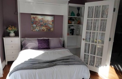 Upon entering this charming suite, you will be greeted by a warm and welcoming atmosphere. You will see the spacious open floor plan consisting of the heart of the home, a large stainless steel gourmet kitchen equipped with everything you need to prepare delicious meals. appliances, dining areas for meals both indoors and outdoors, barbecue utensils, 24” Smart TV with a large island with four stools to enjoy your meals, coffee and the beautiful view of the entrance and garden with lots of light natural through the skylight. Dish and hand soap, oil, vinegar, spices, salt and pepper, coffee, tea and sugar are provided. In the laundry closet you will find the washer and dryer, fire extinguisher, vacuum cleaner, broom, mop, iron and ironing board.