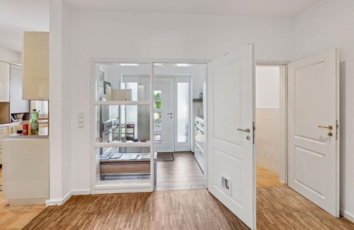 The comfortable and spacious house welcomes you to an idyllic location on the edge of the forest in beautiful natural surroundings. The bright rooms with stylish, modern furnishings make it easy for you to immediately feel at home here. After an eventful day, prepare meals together in the kitchen and make yourself comfortable on the spacious sofas in the evening, while a fire in the fireplace creates a particularly cosy atmosphere.