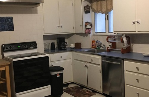 Fully equiped kitchen: stove, microwave, dishwasher, coffee brewer, toaster, plates, glasses, silverware, cooking pots and utensils.