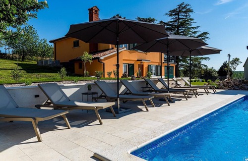 Villa Calla Labin with a beautiful view of the panorama of the town of Labin is an ideal choice for a relaxing vacation and an escape from the hectic everyday life. In front of the villa there is a swimming pool where you can enjoy a refreshing drink during the summer heat. Refresh yourself in the 32 m² swimming pool, which is filled with fresh water. By the pool there is a covered area with a wooden table, ideal for evening outdoor gatherings and enjoying the local Istrian cuisine. On the first floor of the villa there is a modern kitchen, fully equipped with wooden surfaces to convey the atmosphere of Istrian tradition, and a dining room where you can enjoy this atmosphere. There is also a bedroom and a bathroom on the first floor. On the second floor of the villa there is a kitchen, a dining room, a bedroom with an en-suite bathroom and two further bedrooms and a separate bathroom. The bedrooms are furnished in a modern style and have double beds, air conditioning and television. The special beauty of the Labin morning can be experienced on the terrace on the second floor of the villa. The terrace offers a view of the unspoiled nature and is ideal for breakfasts and socializing. Villa Calla Labin is located in Labin. Here you can visit the Dobrova Sculpture Park, which exhibits many interesting sculptures that you can admire during a relaxing walk in the park. Even some of the paths are their own works of art. Another breathtaking sight in the area is the Sentonina Staza. The trail follows the flow of a stream that forms a multitude of small waterfalls, cool blue lakes and lagoons. The city of Pula, just an hour away, is a perfect destination for a day trip with the whole family. Visit the Pula Arena, a real Roman amphitheater. For a glimpse into the more recent past, you can experience the everyday life of an average family in Pula from the early 1950s to the late 1980s in the immersive Museum of Good Memories.