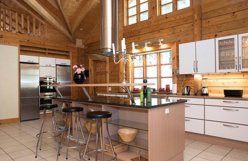This beautiful cottage was built in the style of a Canadian log cabin. The interior reflects the chosen style and you can gather around the huge wooden table. In the living room a stove provides a lot of coziness.