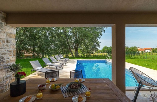 The first floor of the villa consists of an airy living area with direct access to the garden and pool area, as well as a fully equipped kitchen with dining area. A toilet and a bedroom with a single bed are also located on the first floor. The remaining three bedrooms, each with a double bed, are located on the upper floor. One of these bedrooms has an en-suite bathroom and access to one of the two balconies where you can enjoy your morning coffee under the warm Istrian sun.Just a short drive from the villa, above the Mirna river valley, is probably the most famous and attractive Istrian medieval town of Movotun, whose panorama is a well-known symbol of the Istrian inland. Traditional local festivities and the renowned international film festival are hosted here, enlivening this small, peaceful place. The number of towns and villages to visit is too long to list; here we are in the heart of central Istria, one of the most beautiful places in the world. It is also famous for local Teran and Malvazija grapes, olive oil, homemade cheese, prosciutto, grilled meat and of course truffles, which you can taste in restaurants in the many villages and towns in the region. There are numerous hiking and cycling trails, one of the most beautiful of which is the historic Parenzana - old railroad line, where you can even experience the unique ride on the tourist train along the historic route. Horseback riding, a few rounds of golf or simply enjoying the thermal waters of the nearby spa add to this long list of activities. The main coastal towns of Umag, Novigrad and Porec are easily accessible due to excellent road connections and offer very extensive leisure facilities, good nightlife, bars and restaurants.
