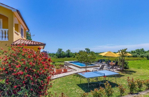 This beautiful vacation home consists of three accommodation units connected by an external staircase. All are air-conditioned and have fully equipped kitchens. This makes the apartments ideal for several families or a group of friends who want to spend the vacation together without sacrificing privacy. Guests have several terraces at their disposal. On the large natural plot there is the outdoor pool and playground equipment for our youngest guests. A large terrace with barbecue invites you to spend unforgettable evenings preparing delicacies and tasting fine wines of the region. The surrounding area is very quiet and well suited for a relaxing family vacation. Check out the excavations of Nesakcium, the oldest city in Istria from the Roman period. Explore the natural beaches of this area and be amazed by the crystal clear sea.