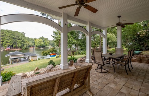 Great vacation home with 4 bedrooms, and 4 baths. Includes updated kitchen, open and spacious family living areas with tons of seating. Game table upstairs as well as ping pong and darts downstairs. Upstairs and downstairs both have large covered decks with ceiling fans and patio furniture to relax. There is a gas grill for cooking out. Boat house with top deck and water deep enough that kids can jump into the lake. Boat house has large flat screen TV, refrigerator, and bar. Splash Island provided for kids to spend hours of endless fun.