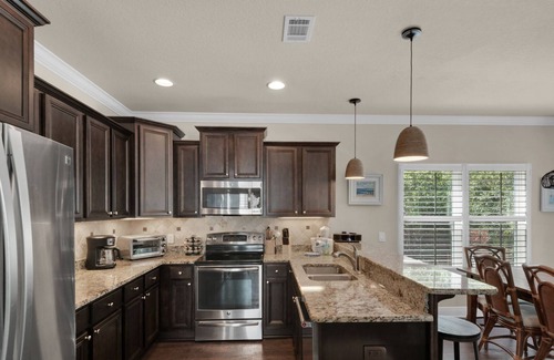 The kitchen has plenty of counter space to keep the chef in your group happy. There is more than enough room for multiple people to help make dinner or prepare beach snacks. This home even comes with a water filtration system; fill your reusable water bottles straight from the tap!