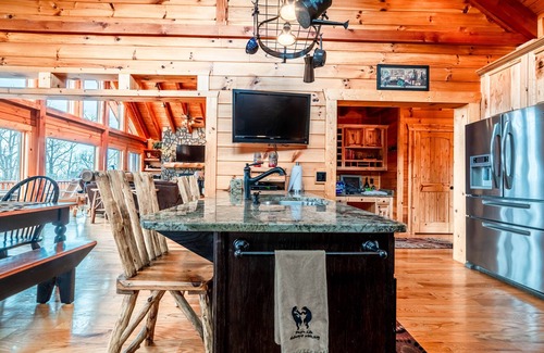 This amazing Log Home features over 4500; square feet of heated living space, the sheer size of The Last Resort is as impressive as its fine appointments. Built with American craftsmanship featuring Douglas Fir beams, reclaimed wood mantels and high attention to detail in area way. Sits on 4 acres of privacy with Mother Nature as your only immediate neighbor. Enjoy a vacation at the highest level of luxury at The Last Resort, an experience in a class all by itself. The Last Resort is a beautiful Log home nestled in the midst of The Majestic Mountain gated community, offering space for corporate retreats, family reunions and much more. The circular drive and main entry features a large covered porch and relaxing porch swing. Once you stroll inside you’ll enjoy all the amenities of a well decorated home with open floor plan and plenty of space for family. Many locally made unique rustic pieces of furniture. A massive stone fireplace stretches through the great room and disappears into the vaulted ceiling 22 feet above. Relax here by the fire and watch as guests enjoy this gourmet kitchen with an island, 2 sinks including an amazing solid granite farmhouse sink. The kitchen is well equipped with a second prep sink with exquisite granite counter tops and backsplash. The formal dining table has seating for eight and is also located within the main living space. Natural light fills this entire area through a wall of windows showcasing the mountain range in view. Additional seating for more guests can be found just beyond the kitchen door on a huge deck with separate fire pit. All the cabinetry is rustic level 2 Hickory solid wood with natural knots, soft close drawers and doors and under counter lighting.