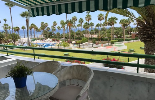 Beautiful and cozy one Bedroom apartment. Has one bathroom, nice living room with sofa/bed with extra places for sleeping, TV with satellite, open type fully equipped kitchen, terrace with table and sun beds From terrace there is very nice views, right in front of the ocean. The apartment is newly refurbished and fully furnished. Apartment is in the quiet and luxury complex with 3 pools, 1 of them is heated. In the complex there is reception, restaurant, bar. Just one minute from the best beach El Duque.
