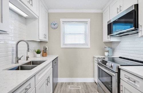 Discover the epitome of luxury oceanfront living at this completely renovated Carolina Beach condo. Offering an expansive two-bedroom, two-bathroom floor plan, this home boasts one of the largest oceanfront decks in Carolina Beach, complete with high dining set and comfortable living furniture. Step inside and be greeted by the elegant living area adorned with new flooring and tasteful crown molding, creating an inviting atmosphere for relaxation and entertainment. The fully renovated kitchen is a culinary enthusiast’s dream, featuring top-of-the-line cabinetry, exquisite quartz countertops, a custom backsplash, under-cabinet lighting and high-end stainless steel appliances, including a convection oven range.