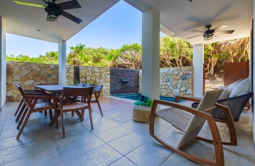 • The first floor terrace has a beautiful heated salt water pool with an LED light system and waterfall fountain, an eight person dining table, living area, relaxing hammock, and a gate to the protected mangrove forest with a descending path to the seasonal & weather permitting beach / ocean below. Please see "Beach & Ocean Access" below for detailed information on this area. There is a bathroom with a rainfall shower located at the front of the house to wash off your sandy feet before heading back inside.