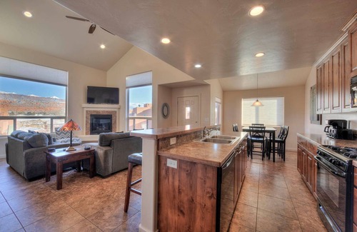 Step into our inviting living room, where you'll find a cozy fireplace, perfect for chilly desert evenings. Relax on the comfortable sofas while watching your favorite shows on the large flat-screen TV, or simply take in the panoramic views of the surrounding red rocks through the expansive windows.