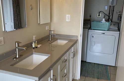 Bedroom tucked away down the hall with an ensuite bath and a washer/dryer in the hallway. Comfy, brand new king sized bed with separate AC in the bedroom. Large 15 foot balcony in the bedroom so you don't miss those views! Want to sleep in, close the curtains, turn on the AC and have a great night's sleep to ready yourself for your daily adventures!