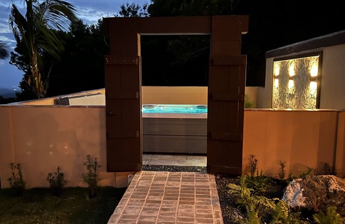 This farm house welcomes you with rustic wooden doors made by mountain workers that transport you to a Mediterranean scenery. Its combination of wood and cement creates an extremely warm and welcoming environment. Upon entering this beautiful property, you can see the spacious terrace and spa area in the background. Its luxurious terrace is ideal for enjoying the cool weather and amazing views of the Caribbean Sea. The pergola with dining area is perfect for outdoor dinners while enjoying the stars in the sky. To the left side of the pergola, is where the very private and cozy spa/jacuzzi is located.