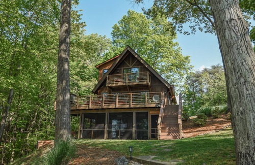 Charming A-frame home has stunning water views from all 3 levels of living! Large deck with plenty of seating on main level, a balcony on top level off master bedroom, and a screened-in porch on the bottom level, also with plenty of seating.
