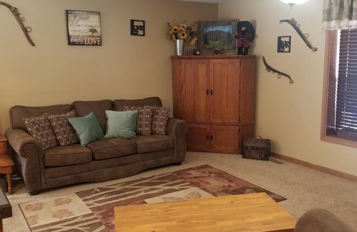 American Pines Lodge is a 3 bedroom, 2 bathroom home that can sleep up to 12 people with a queen bed in each room, a sofa sleeper in the living room & 4 portable cots. There are 2 full bathrooms, one being a master bath with a soaker tub, fully furnished kitchen, living room area with satellite TV & DVD player, as well as front & back decks with propane BBQ grill & yard area with a fire pit. This is a side x side duplex & we, the owners live in the other unit. There is a dual locking door between the 2 units. Located just 5 miles from Mt. Rushmore & 2 miles from downtown Keystone, American Pines Lodge is close to most major attractions but sets on 4 acres of mountain meadow in a beautiful valley with Battle Creek running through the property. Our other listing, American Pines Cabin, is also on the same property. There is a playground & basketball court available for our guests. Hiking & biking trails are accessed right off the property as well as ATV/UTV rentals through Black Hills Wilderness Edge to get off the beaten path & experience the Black Hills. Come see why we've been blessed to call the Black Hills home & want to share it with you.