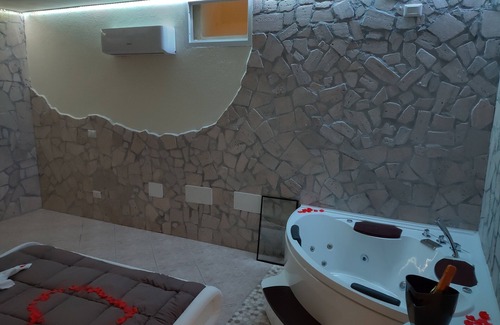 3. Romantic Cave - graziosa suite rivestita in pietra con vasca idromassaggio e sauna in camera oltre a bagno con doccia;