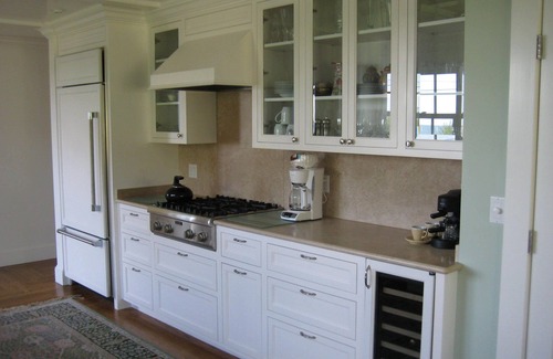This 2300 sqft home features three bedrooms (a King, a Queen and two twin beds) and two full baths. On the first floor is a beautiful new kitchen with Limestone Counters, Thermador stainless steel appliances, Sub Zero refrigerator and Bosch dishwasher. The family room with fireplace is off the kitchen and boasts a vaulted wood ceiling. There's a French slider to a large stone patio with outdoor dining under a large umbrella. The gas grill is new and is easy to use. Also on the first floor is the living room, dining room and den. Off the living room is a french door that leads to a scrumptous stone porch with awning and side curtains - you'll spend lots of time here watching the ocean/beach and relaxing. There's a bedroom and full bath on the first floor, as well. The second floor has two bedrooms and a new full bath. There's a good size yard and parking for two cars. The property also has a one bedroom guest house (new) that could be rented with the house for an additional price. When it is not rented it is used by the owners.