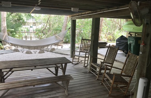 The Green’s Island House #1 amenities include:: HD cable service to 50" LCD TV in the living room, 40' LCD in the master br, plus a 20' flatscreen and Amazon FIreStick in the guest bedroom, CD Stereo entertainment system, FREE High-speed wireless internet access, central A/C, ceiling fans in every room. Fully-equipped kitchen including: stainless appliances, microwave, drip coffee maker (basket) PLUS a Kuerig machine, toaster, blender, dishwasher, and garbage disposal, dining room table seats four, Patio table seats four on upstairs deck, Picnic table on downstairs deck, Laundry room with full size washer/dryer; Freshwater swimming pool*, Private dock slip at end of protected, Mangrove-lined canal; Extra outdoor hot/cold shower, two new beach-cruiser bicycles for use, Full-size Weber charcoal kettle barbecue grill, four beach chairs, umbrellas, hammock for under house. Golf cart rentals are also available on island.