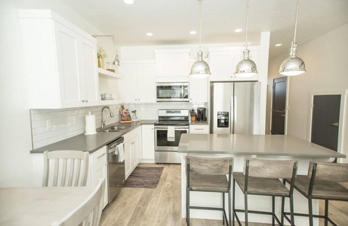 An Oasis View is a combo of 2 townhomes in Freedom Village. The Oasis and The View sleep up to 20 in beds. Each unit has 4 bedrooms and 4 bathrooms. They are not connected by a passthrough door but are located next door to each other. Both homes have an open concept main floor with well stocked kitchen for preparing meals and room for the whole family. It's a great place to spend time together! Off the main living areas are 2 open patios with seating, perfect for relaxing in the evenings or whenever you want some fresh air!