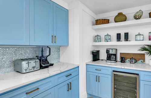 The heart of the home is the fully remodeled kitchen, complete with new custom cabinets, modern appliances, sleek quartz countertops, and a delightful coffee bar where all the coffee is provided for your convenience.