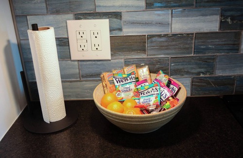 The kitchen is fully stocked with dishes, silverware, pots and pans, and etc. It has an island with granite countertops that will accommodate seating for two. A coffee bar is also included with a Keurig coffee maker and Starbucks coffees.