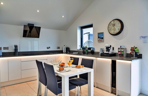 The living area is open plan with dining, plenty of seating, 65" smart TV and a fully equipped kitchen with integrated fridge/freezer, oven, induction hob, microwave, wine cooler, dishwasher and washing machine/tumble drier. The apartment has underfloor heating throughout. Large bi-fold doors open out on to the balcony which is 7.1 metres wide and has plenty of comfortable outside seating from which the fabulous views can be enjoyed.