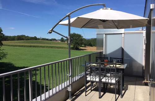 New apartment of 60 sqm, 4th floor, offers all the comforts for your vacation rental. The kitchen is fully equipped, the apartment is very bright, facing south west. You have a large quiet terrace to enjoy the views of the countryside and mountains. All rooms have access to the terrace. A private parking condominium will allow you to park your car at the foot of the building.