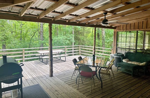 A spacious, wrap-around porch with a grill, rocking chairs, patio tables, and chairs provides the perfect setting for gathering with family and friends. During the cooler seasons, guests can sit around the fire pit and enjoy the crisp air and s'mores. A spring-fed creek can be accessed at the bottom of the hill from the cabin, and hiking trails abound for outdoor enthusiasts.
