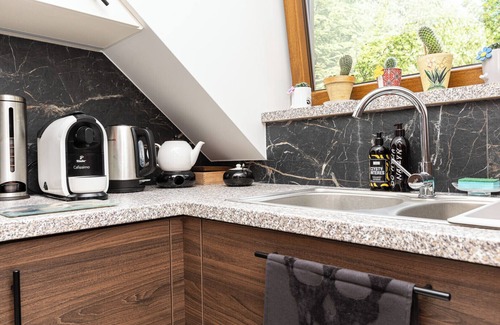 The apartment itself is furnished with great attention to comfort and a homely atmosphere. It's the perfect place to relax for families with children, couples, or groups of friends. The interior is warm, bright, and functional – it consists of a room with a double bed, a desk, a table with armchairs, and a single bed behind a wall. There's a living room with a comfortable sofa bed, a mezzanine with a double bed, a fully equipped kitchen, and a modern bathroom.