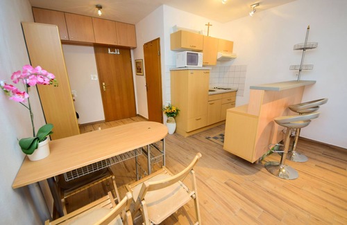 1-room apartment 33 m2 on 3rd floor, north facing position. Studio with sloping ceilings, ceiling height 100 - 240 cm with 1 sofabed (80 cm, length 190 cm), 1 french bed (140 cm, length 200 cm), satellite TV (flat screen), air conditioning. Exit to the balcony. Open kitchen (2 hot plates, microwave) with dining table. Shower/WC. No heating option. Balcony 4 m2. Balcony furniture. Marvellous view of the sea. Facilities: Internet (WiFi, free).