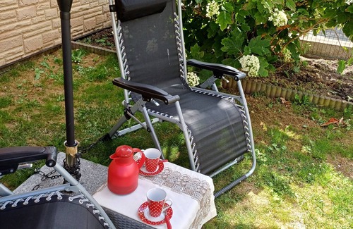 The modern and comfortably furnished 32 sqm apartment is located on the ground floor of our house, is made of lime green and has a small kitchenette with dining area, a wet room (shower, toilet), and a combined living and sleeping area.