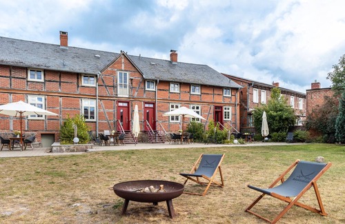 The four vacation apartments are located in a lovingly and naturally restored manor house in Helle, a town near Pritzwalk/Prignitz. The old manor was originally built in 1826 and is now, after years of natural restoration fundamentally renovated. Quaint and modern at the same time, it enchants with many original details. The apartments are sustainable and naturally renovated, with adobe walls and charming furnishings. A real oasis of well-being to slow down and relax. Or to get creative. A huge courtyard invites you to linger. Unwind, feel nature and enjoy peace and quiet - the Prignitz region in Brandenburg is ideal for this. The village of Helle is a tiny place, only about 1.5 hours from Berlin or Hamburg, but like in another world. Helle has about 38 inhabitants and is one of the last Rundlinge Deuschlands.More horses than people and the feeling suddenly to live in 1950 (only with more comfort, Internet and Netflix.Directly nearby you can make canoe trips on the Stepenitz (nature reserve) or fishing. Cycling and bike tours are possible on some beautiful designated bike routes. Helle is located directly on the Brandenburg Cycling Route. Having a car is an advantage, because Helle with its 38 inhabitants has no shopping facilities. Buses do not run that often, but they do exist. Parking is free in front of the farm.