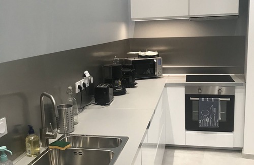 The kitchen is equipped with: refrigerator, electric baking plate, microwave, oven, dishwasher, a vacuum hood, a Nespresso coffee maker, a filter coffee maker, a toaster and a kettle.