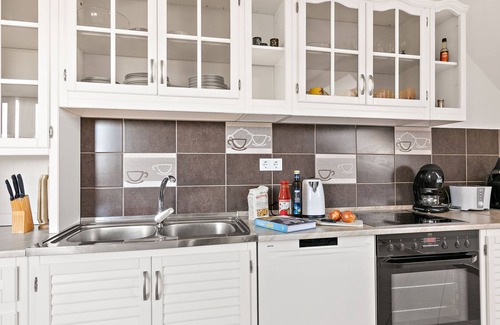 "Beate", 5-room apartment 120 m2 on 1st floor. With sloping ceilings, modern furnishings: living room with satellite TV and air conditioning. Exit to the balcony. 2 rooms, each room with 2 beds (90 cm, length 200 cm). 2 rooms, each room with 1 french bed (160 cm, length 200 cm). Open kitchen (oven, dishwasher, 4 ceramic glass hob hotplates, toaster, kettle, microwave, electric coffee machine) with dining table. Shower/WC, sep. WC. No heating option. On the lower ground floor: kitchen (4 hot plates, oven, dishwasher) with separate WC. Exit to the garden. Balcony, patio roofed. Balcony furniture, barbecue, deck chairs (6). Facilities: washing machine, baby cot. Internet (WiFi, free). Please note: non-smokers only. Private entrance. MA19011110