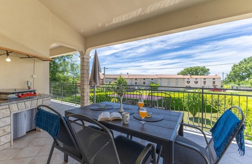 The holiday apartment Chiara is located in Susnjici, a village near the touristic town of Porec and 9 km from the sea and the beaches. The apartment is on the first floor and has a private entrance and separate steps. It consists of one room with a king-size bed, one room with two single beds, and one bedroom with a single bed. The kitchen, dining, and living room have access to a beautiful balcony with a view of the countryside and the surrounding area. The kitchen is fully equipped with a refrigerator, microwave oven, stove, oven, toaster, and coffee machine. There is satellite TV and air conditioning available in the living room. In front of the house, there is private parking available. Apartment Chiara provides you with a relaxing and comfortable stay. Friendly hosts who live on the ground floor are at your disposal for any kind of questions! In just a few minutes by car, you can reach the most popular Aquapark in the region, located in the direction of the beaches in Porec.