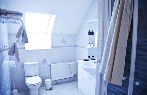 Spacious bathroom with shower cubicle, WC, and hairdryer.