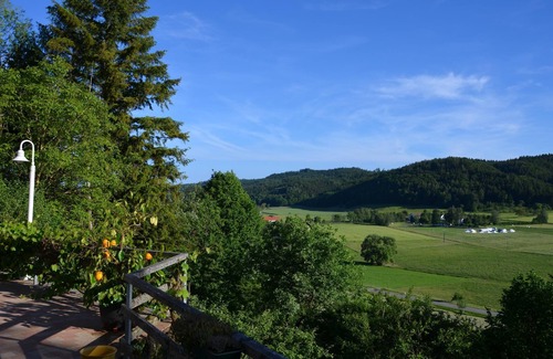 Ferienparadies Bodensee with FeWo1 is located near Lake Constance, in the village of Billafingen in Baden Württemberg. The 55 square meter four-star vacation apartment has a living room, a very fully equipped kitchen with dishwasher and much more, a bedroom, a handicapped accessible bathroom and thus offers space for max. 3 people. Facilities include WLAN (suitable for video calls), a TV & radio as well as a crib and a high chair (on request). The communal outdoor area (6000 sqm) has a pool with sunbathing lawn, a garden, an open south-facing terrace with valley and mountain views and a barbecue. The nearest supermarket is in the center of Owingen, which is 4 km away. Lake Constance with its Mediterranean shore (and thermal spa) is located near Überlingen, which is a 10-minute drive (7 km) away. The nearest airport is in Friedrichshafen, which is 50 minutes (45 km) away by car. E-bikes can be rented on site (don't forget your helmet). Charging stations for e-bikes and a wallbox for e-vehicles are available. When it snows, there is access to a cross-country ski trail and the possibility to rent snowshoes from the landlord. On request, the host will fill the fridge for the day of arrival with organic produce from the region or from the supermarket. The hosts also offer specially roasted 100% Arabica coffee and pressed apple juice from their own apple trees. If you wish, baked goods can be left on the door at the weekend in the morning. You can also buy water, beer, wine, eggs, butter and other drinks from the hosts. All hygiene requirements are met. Parking is available on the premises of the accommodation