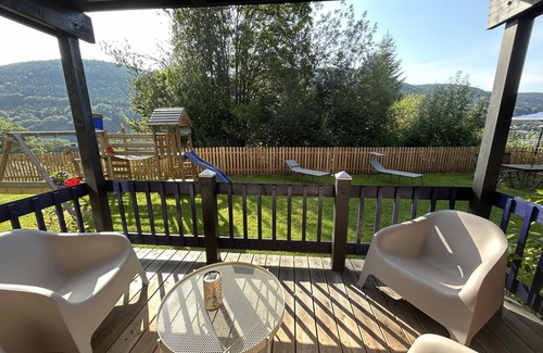 The holiday apartment Ferienwohnung Kuckucksnest with step-free access and interior is located in Bad Wildbad and impresses guests with its view of the mountain. The 60 m² property consists of a living room with a sofa bed for 2 people, a fully-equipped kitchen, 1 bedroom and 1 bathroom as well as an additional toilet and can therefore accommodate 4 people. Additional amenities include high-speed Wi-Fi (suitable for video calls), a smart TV with streaming services, a washing machine as well as children's books and toys. In addition, a table tennis table and a shared gym are available for your use. A baby cot and a high chair are also available. This accommodation features a private outdoor area with a covered terrace and balcony.