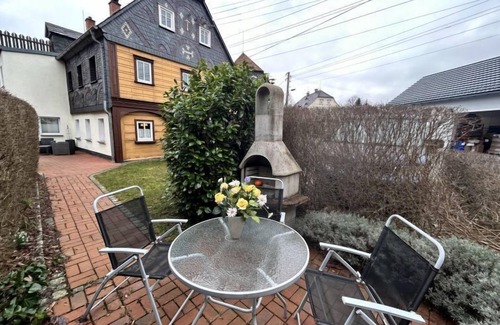 Historical house "Selma". 4 apartments in the property. In the centre of Großschönau, 12 km from the centre of Zittau, 30 km from the centre of Löbau, 20 m from the river. For shared use: natural state property with meadow. Patio, garden furniture, barbecue, fireplace. In the house: storage room for bicycles, washing machine. Parking on the premises. Shop, supermarket 500 m, restaurant 100 m, bakery 20 m, bus stop "Großschönau Spitzkunnersdorferst" 180 m, railway station "Großschönau Bahnhof" 1.5 km, outdoor swimming pool 1.5 km, bathing lake "Olbersdorfer See" 13 km. Walking paths from the house 5 m, ski lift 4 km, ski school 4 km, cross country ski track 4 km. Well-known ski regions can easily be reached: Waltersdorf 4 km. Please note: car recommended. The owner lives in the same residence.