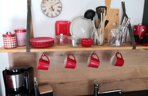 The completely renovated apartment offers space for 2 people in a charming old building. It has a comfortable box-spring bed and a very spacious spa area, as well as a lovingly furnished kitchen with creative details in a modern Black Forest style. In the middle of the small town and yet quiet, there are nearby, free parking and shopping facilities within walking distance. NR, no pets possible. Bookable from 3 nights. Kandern is a small artists' town in the Markgräflerland, with an annual pottery market. There are many hiking opportunities around the town - on foot or by bike - in the Black Forest and the Rhine plain. Numerous museums in the surrounding area make the hearts of art lovers beat faster. Garden lovers will also get their money's worth with 2 renowned perennial nurseries in the area. (Landhaus Ettenbühl and Staudengärtnerei Zeppelin). Due to the favorable location in the border triangle, Switzerland and France can be reached in less than 30 minutes by car for day trips. Kandern has a sports pool for hot days, and there are thermal baths and a natural lake in neighboring villages.