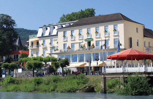 Stylish, family-run hotel (3 star superior) in a fantastic location right on the Rhine. Enjoy the direct view of the river on our garden terrace covered with plane trees. Let yourself be pampered in the hotel restaurant. In addition, waiting for you in the house, as an oasis of well-being, massage, shiatsu and cosmetics, as well as a Finnish sauna and a Roman steam bath. With the help of a wheelchair lift is our hotel and also the restaurant of the promenade for each guest attainable. In the house itself is an elevator. Free parking is directly at the hotel, parking spaces 4, - € and garages 8, - € and a bicycle rental are in the courtyard behind the house. Telephone: 02633/473526