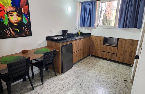 Complete apartment, with everything basic to be comfortable on your visit to Medellin, private equipped kitchen, private bathroom, iron, refrigerator, fan, it is very well located in a quiet and safe area, with access to parks, restaurants and just 10 minutes away walking distance from Plaza Mayor, the intelligent building, Unicentro and much more, its location is perfect to get to know the city since it is in Laureles Conquistadores, from there you can go to parties, most important tourist sites and so on.