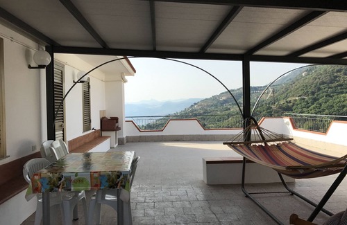 Apartment consisting of 1 bedroom with double bed. Living room-kitchen with cooking area: 4-burner stove and 1 gas oven, living area: double sofa bed, fireplace, table with chairs. Bathroom with sink, shower-box, bidet, WC. Large terrace (partly covered) with table, chairs, hammock, charcoal barbecue. Panoramic view on the beaches of San Giorgio, Gulf of Patti and Tindari, Capo Milazzo, Aeolian Islands. In the private area of the house is available for car parking. The house is located in the hills above San Giorgio di Gioiosa Marea. There are tours for all locations mentioned: Aeolian Islands, the archaeological sites of Tindari, Gioiosa, Patti Villa Romana, Etna, Alcantara Gorges, Taormina, Cefalu, Palermo etc.