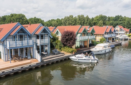 All the accommodation types at Hafendorf Rheinsberg are located on the water and many come with a private dock. They are discreetly arranged in rows, without seeming too imposing. You have the choice of 2 variants: a 4-person (DE-16831-08) or a 6-person (DE-16831-09). Both types are fully furnished in a neat and comfortable design. Each comes with a dishwasher and a cosy woodstove. There is a terrace and/or balcony with garden furniture for optimal enjoyment of the surroundings and outdoor living.