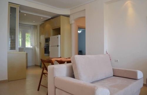 A stylish holiday apartment with sweeping views of the sea and Saranda's cityscape, this well-appointed property comfortably hosts up to five guests. It features two bedrooms—one with a double bed and the other with two single beds—alongside a sofa bed in the open-plan living area. The large, furnished balcony offers a perfect spot to unwind while taking in the scenery. This non-smoking, pet-free apartment welcomes children and is ideal for families or groups seeking a relaxing and well-located coastal retreat. Positioned just steps from the beach, the apartment sits in the heart of Saranda’s vibrant city center. Guests can enjoy easy access to local cafés, restaurants, and convenience stores, as well as the bustling promenade and cultural landmarks. The popular Santa Quaranta area and local markets are within walking distance, while public transport connections and the nearby ferry terminal provide direct access to Corfu and its international airport, making travel in and out of Saranda both simple and efficient. The apartment is equipped with a modern kitchen, complete with appliances for convenient meal preparation during your stay. Two bathrooms, each with a shower, offer added comfort and privacy for multiple guests. Additional features include air conditioning, Wi-Fi, a TV, a washing machine, and a spacious terrace, ensuring guests enjoy both functionality and comfort throughout their vacation.