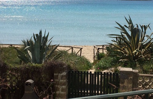 Private and exclusive apartment in a villa on the first floor, with panoramic views of the splendid bay of the Dunes of Porto Cesareo and with private access to the beach. What makes it exclusive is its position and consequently the privilege not only of being directly on the beach, but above all of enjoying the sea view from the large and scenic veranda. The apartment, comfortable and carefully furnished, consists of two bedrooms (triple and double), bathroom with shower, kitchen, panoramic living room and equipped veranda. The property has a garden on the street side, with a shaded parking space, and a garden on the sea side with private access to the beach, outdoor shower and barbecue. The apartment is equipped with air conditioning, ceiling fans, mosquito nets, TV and washing machine. Two bicycles and two beach beds with umbrella are also available for guests.