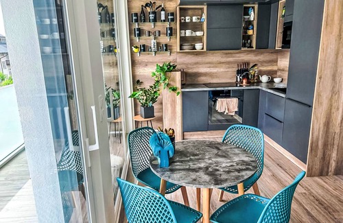 "Klára", 2-room apartment on 2nd floor. Very modern and tasteful furnishings: living/dining room with 1 double sofabed and satellite TV. Exit to the balcony. 1 room with 1 double bed. Kitchenette (oven, 4 induction hot plates, kettle, microwave, electric coffee machine) with dining table. Shower/WC. Floor heating. Balcony. Balcony furniture. Facilities: washing machine. Internet (WiFi, free). Garage. Please note: suitable for families. Non-smokers only.