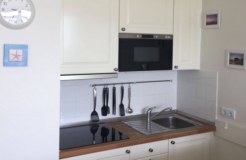 The modern 2 bedroom apartment in the 10th Stock in directly on the beach overlooking the Baltic Sea awaits in any weather vacationers who want to start with a beautiful view of the sea the day. Stylish decor including flat screen TV and cuddle couch invites you to relax and makes for cozy evenings. White painted walls and high quality flooring give the 42 sqm apartment optically a special flair that invites you to relax. The cupboard can be converted with fast handle in a comfortable double bed with new bed bases and latex mattresses, so that even in the morning immediately after waking up can enjoy the sea view. The small country-style kitchenette includes everything you both for morning coffee and requires a delicious dinner. 4-ring ceramic hob, fridge, sink, dishes and worktop with extractor guarantee cooking fun on vacation The tasteful bathroom with terrakottafarbenem floor and white tiled walls ensures relaxation after a busy vacation day. Both shower and toilet and vanity are kept in subtle white. In addition to the comfortable double bed in the living area there is another small interior room with two sleeping possibilities for children or guests. A bunk bed with new mattresses is here for restful nights ready. The apartment is equipped with electric external blinds. 2 bicycles are available for free use. Bed linen and towels are please bring!Coin-operated washing machine and dryer are in the basement.