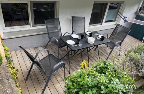 The approx. 50m² apartment is located in a 2-family house, which is in a quiet yet convenient location. The granny apartment, renovated in 2025, is ideal for a vacation with up to 2 people. The bedroom can be prepared with either a double or single bed (2x 90x200). The living room has a comfortable couch, which can also be pulled out into a sleeping area (133x192) for another 1-2 people for shorter stays. The modern kitchen has a stove with ceramic hob, oven, dishwasher and a high table with bar stools as a small dining area. The bathroom has an easily accessible shower, WC and washbasin, as well as towel heating. The terrace with garden furniture is accessible via the outdoor area and invites you to relax. The entire apartment is fitted with tiles/vinyl flooring. A free parking space on the property can be provided on request.